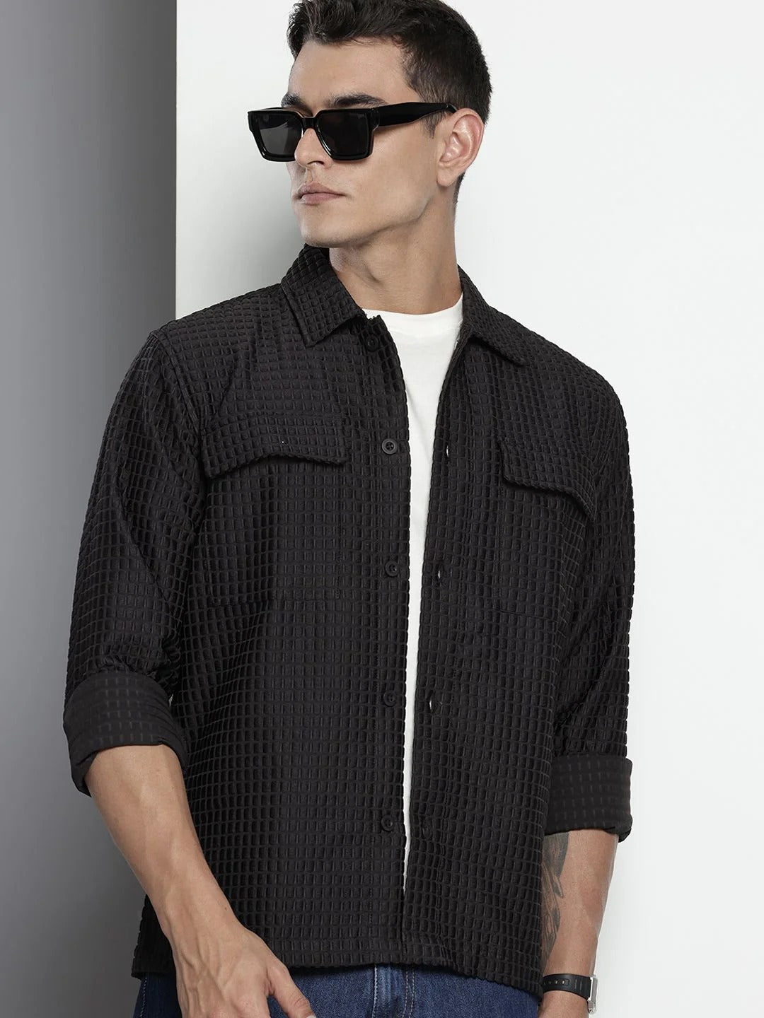 Designed for both superior comfort and contemporary flair, it includes a classic spread collar, full sleeves that can be easily rolled up for a relaxed fit, and two practical chest pockets with flap closures that enhance its modern appeal. Whether you're aiming for a sleek urban look, a laid-back weekend outfit, or a smart casual ensemble, this black textured shirt is designed to make a statement while keeping you comfortable.